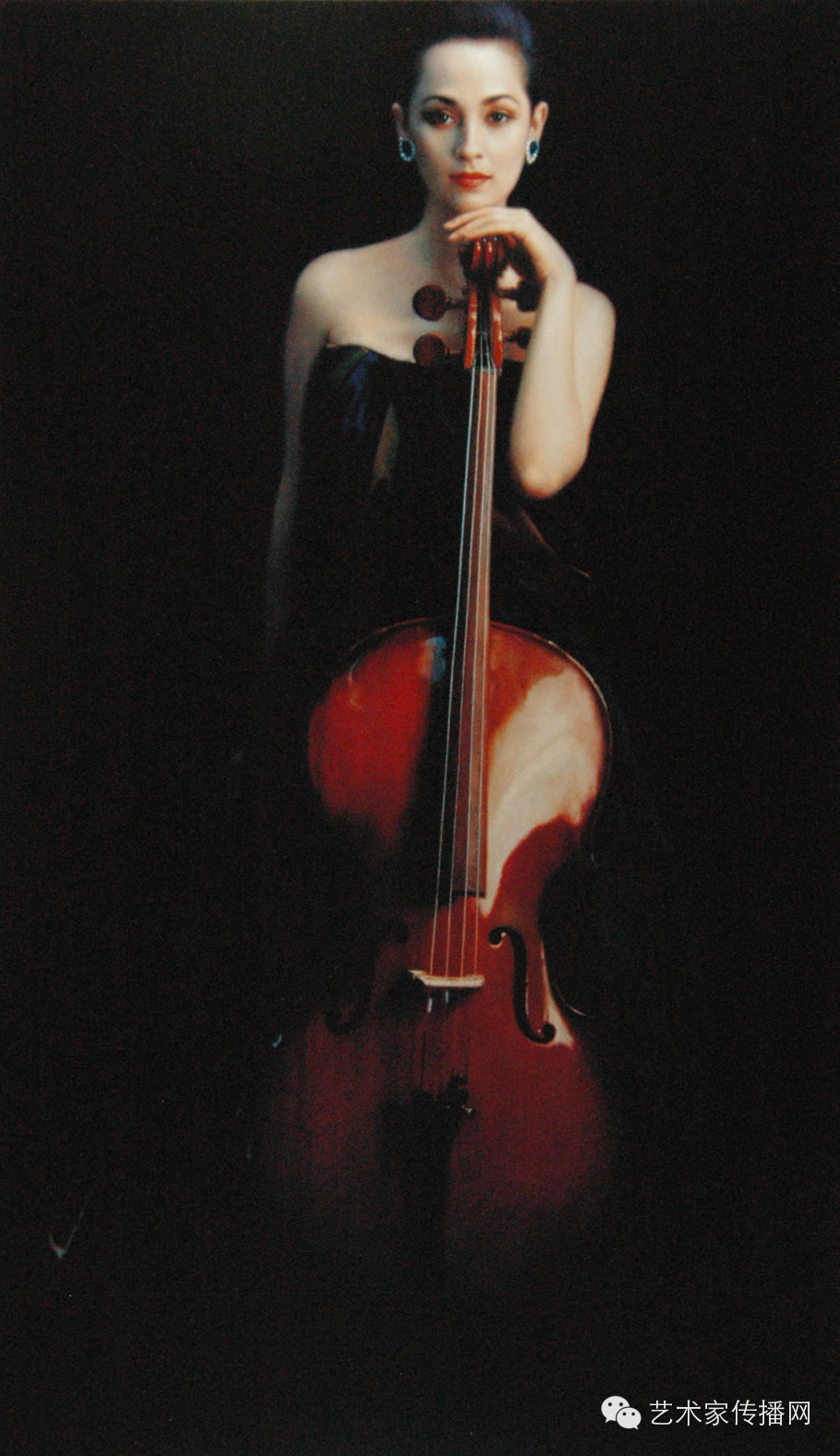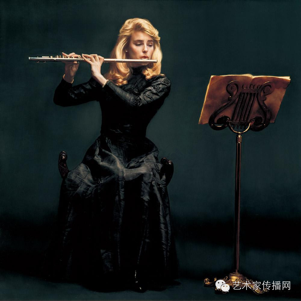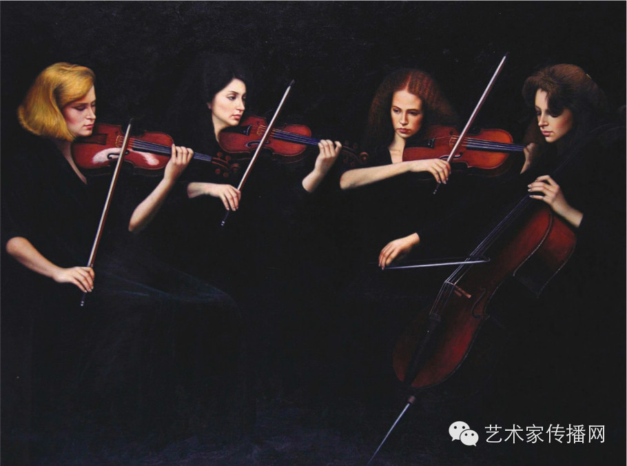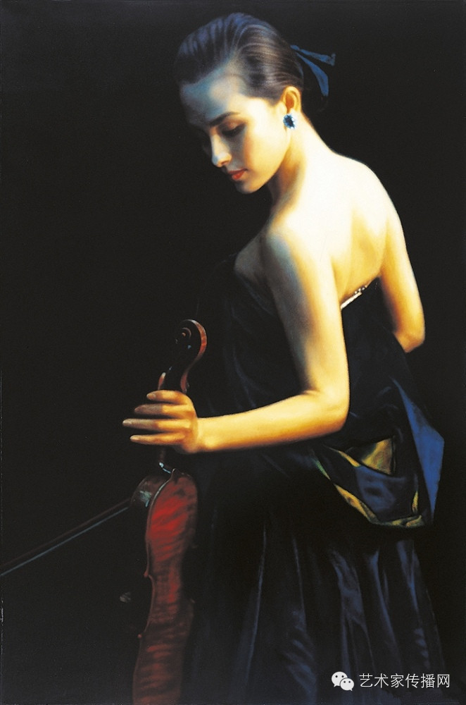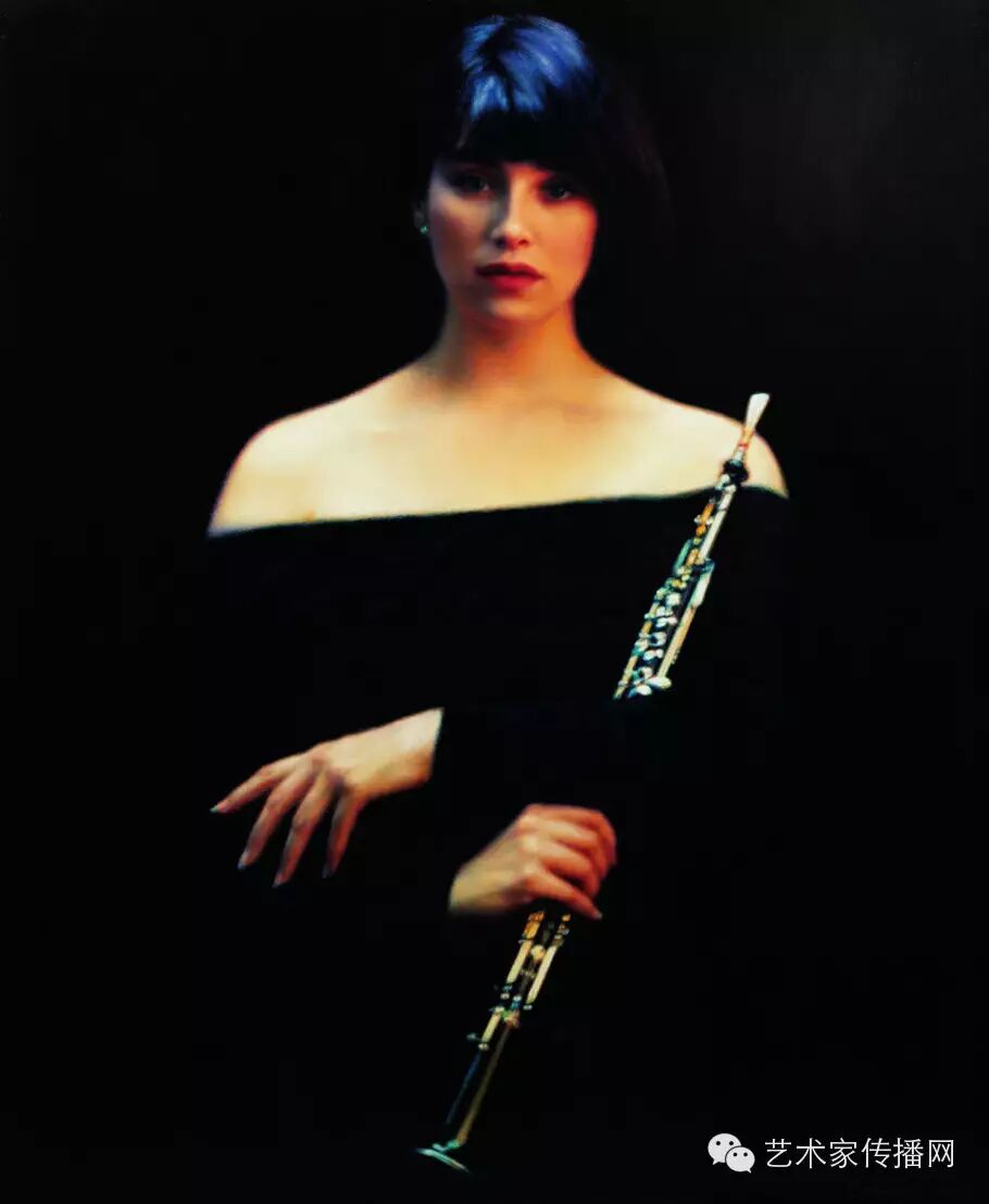 画家把自己所画的人物置于空旷背景上的雕塑,其造型力度异常扎实、完美,技巧近乎炉火纯青。他采用美国照相写实主义的技法描摹的现代、高贵、优雅的西方美人画面形成音乐家、乐器和乐曲之间微妙的呼应关系。画面有旋律感,构图及人物处理有现代感,背景大胆启用黑色,给人无穷的想象。