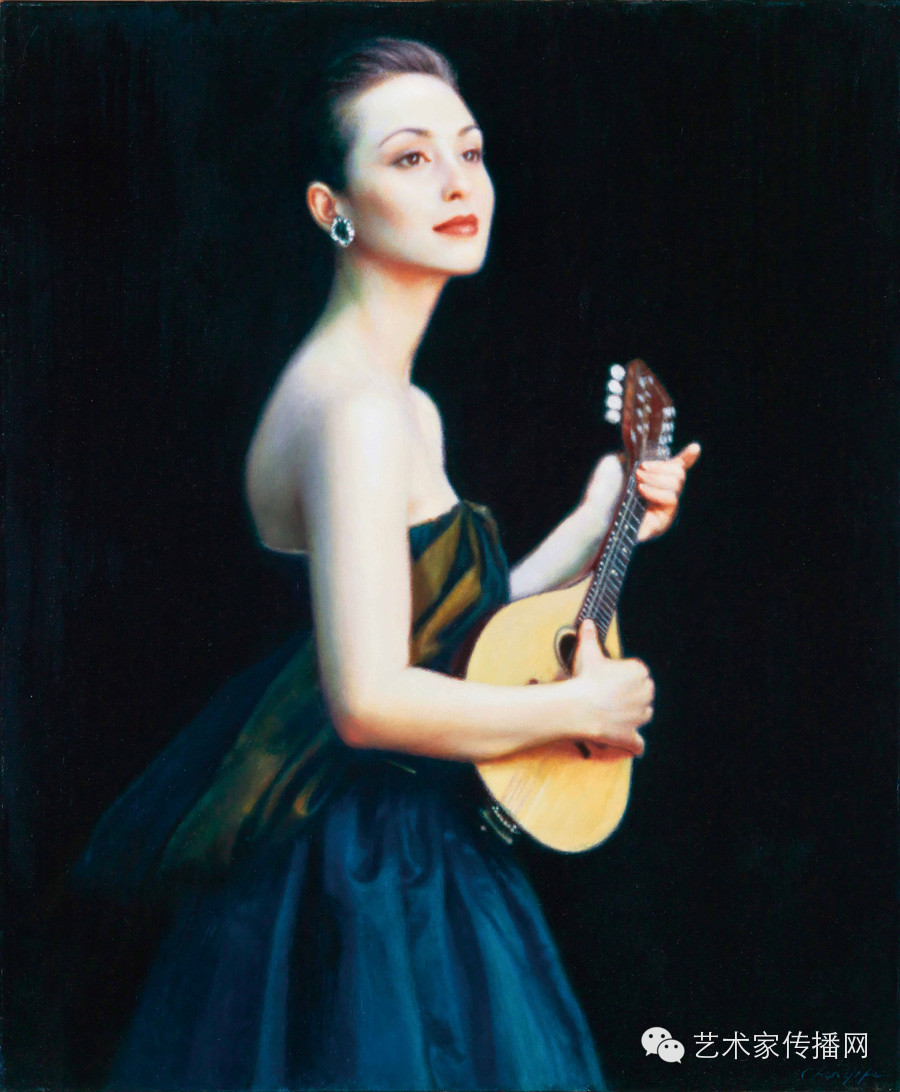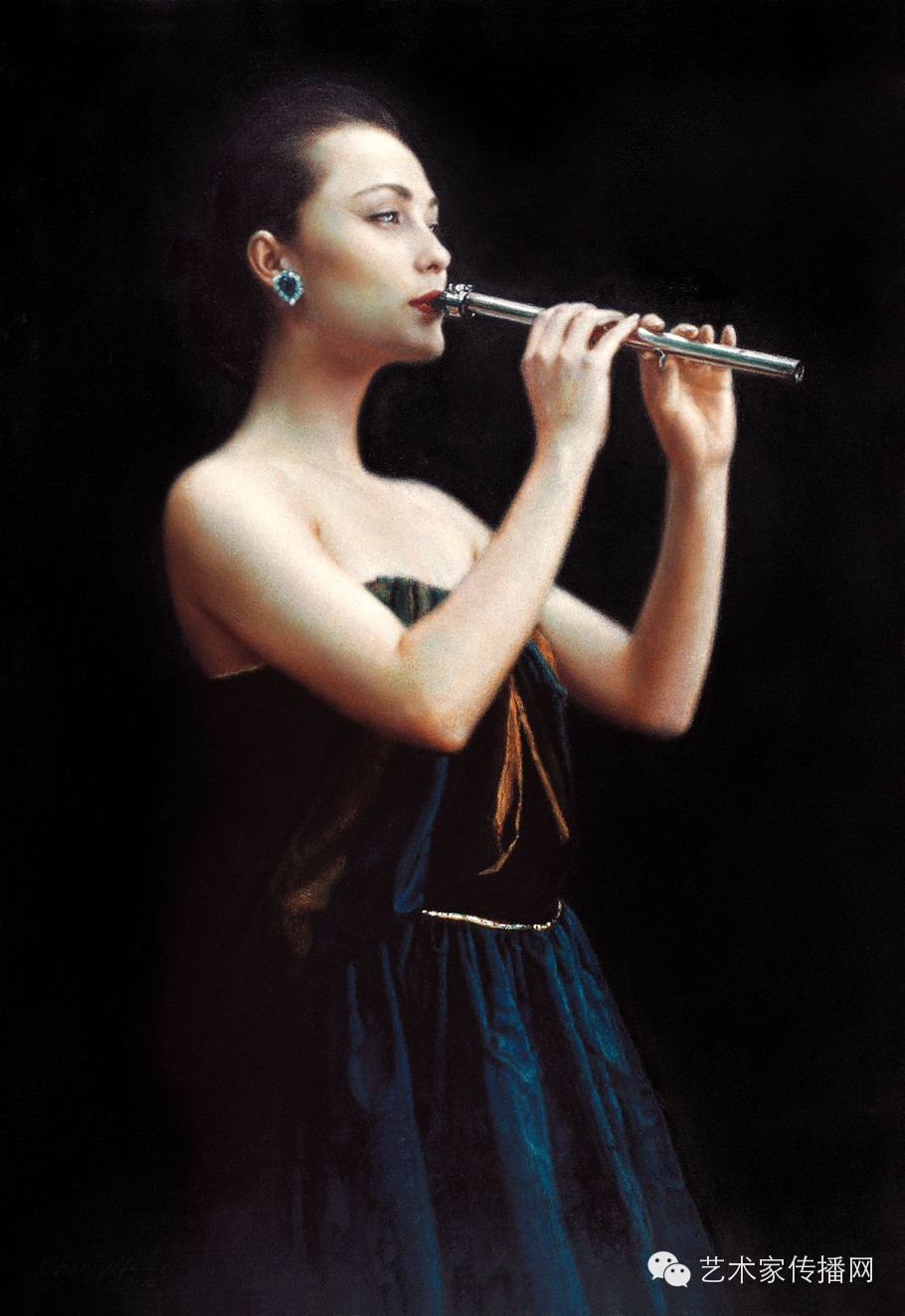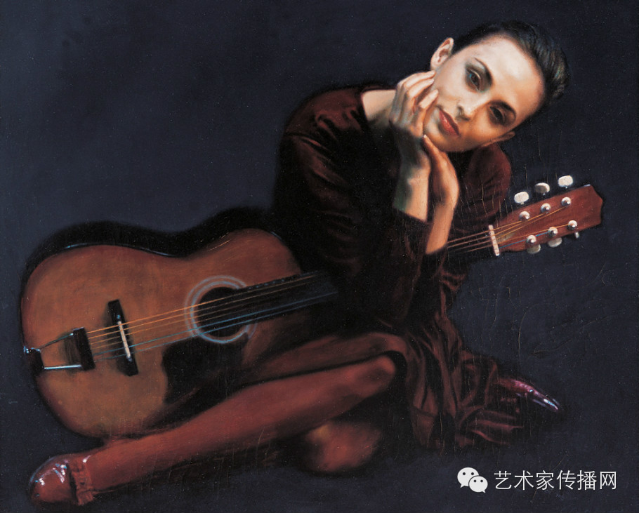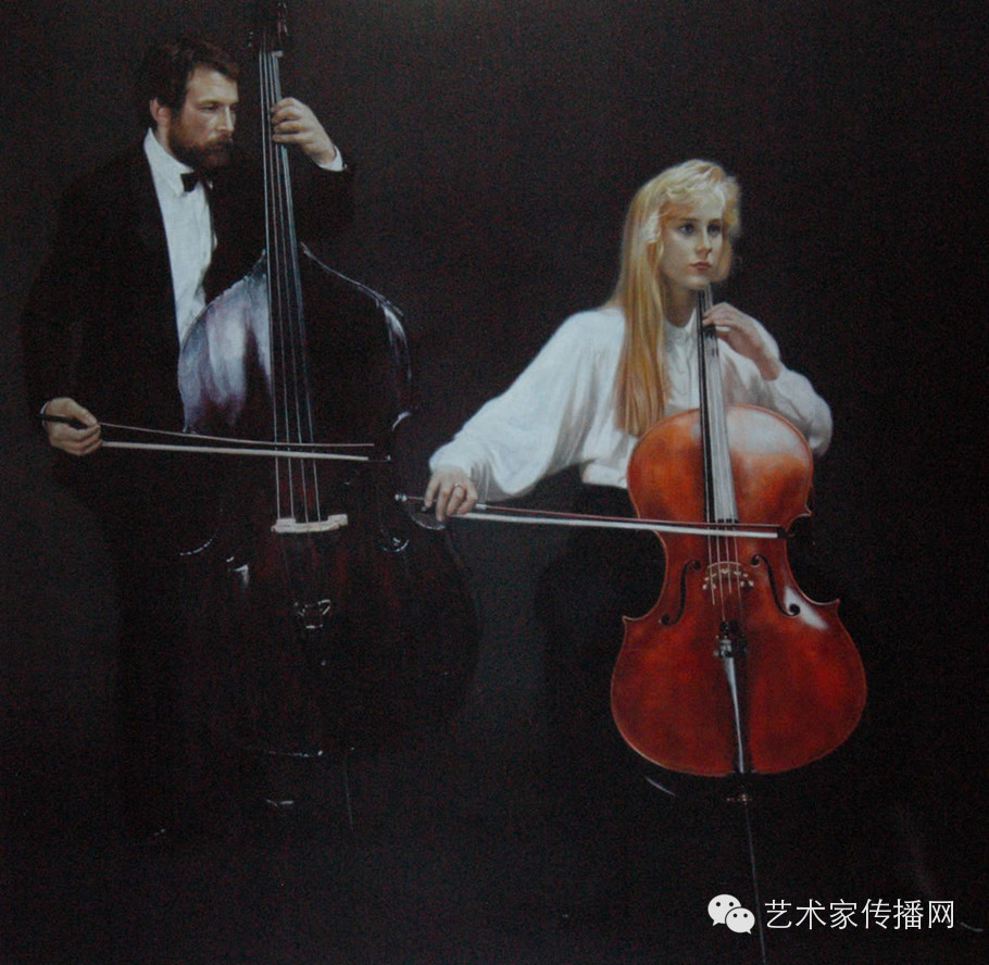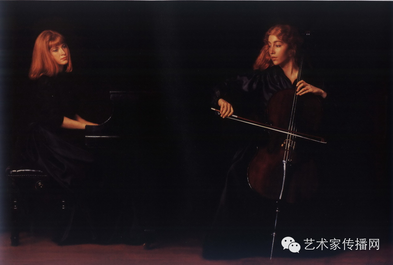 画家把自己所画的人物置于空旷背景上的雕塑,其造型力度异常扎实、完美,技巧近乎炉火纯青。他采用美国照相写实主义的技法描摹的现代、高贵、优雅的西方美人画面形成音乐家、乐器和乐曲之间微妙的呼应关系。画面有旋律感,构图及人物处理有现代感,背景大胆启用黑色,给人无穷的想象。