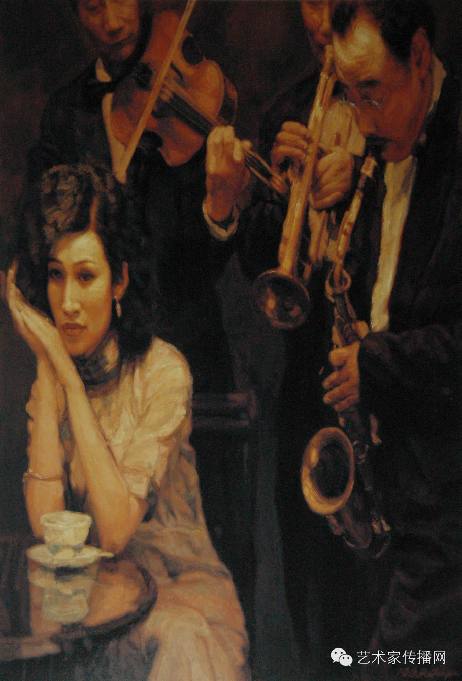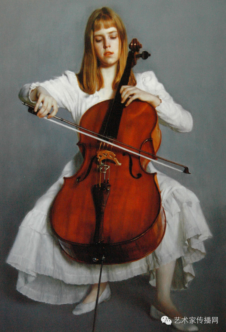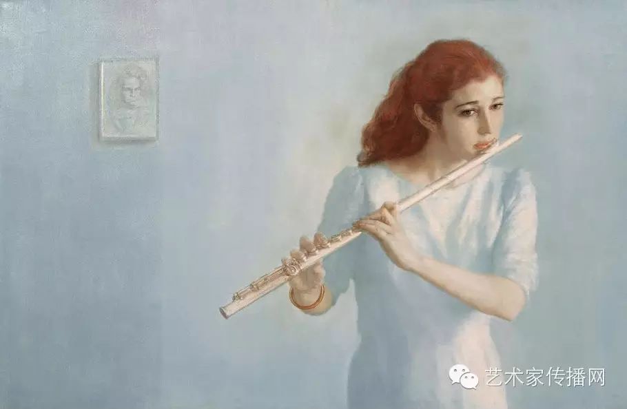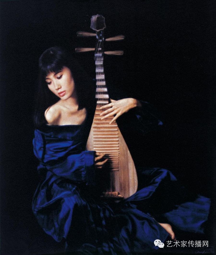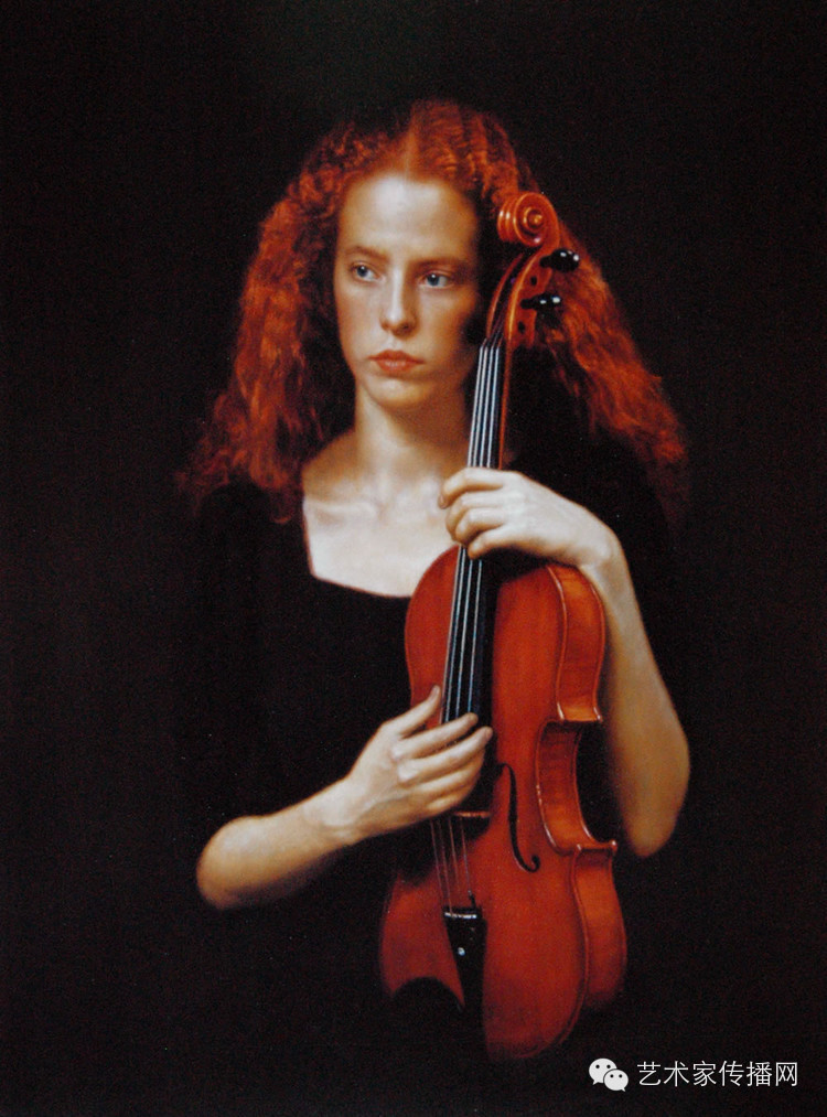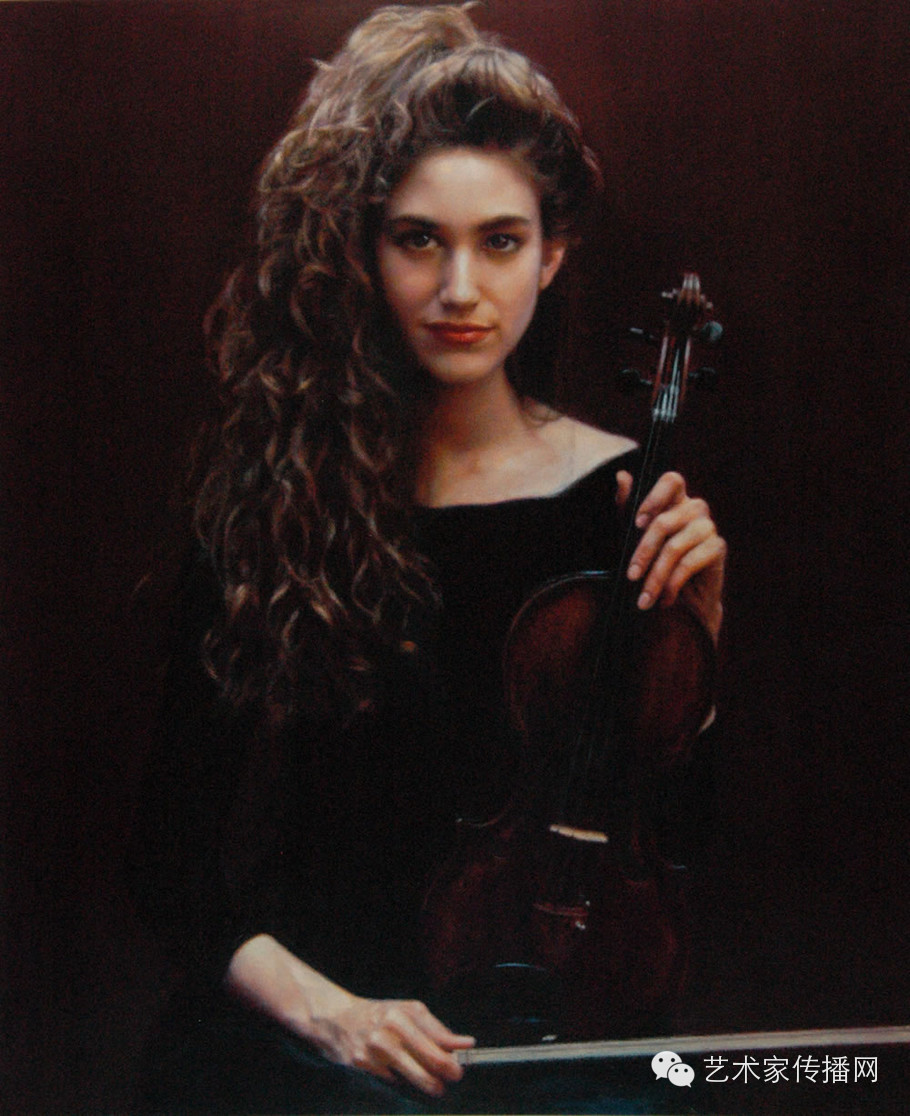 画家把自己所画的人物置于空旷背景上的雕塑,其造型力度异常扎实、完美,技巧近乎炉火纯青。他采用美国照相写实主义的技法描摹的现代、高贵、优雅的西方美人画面形成音乐家、乐器和乐曲之间微妙的呼应关系。画面有旋律感,构图及人物处理有现代感,背景大胆启用黑色,给人无穷的想象。