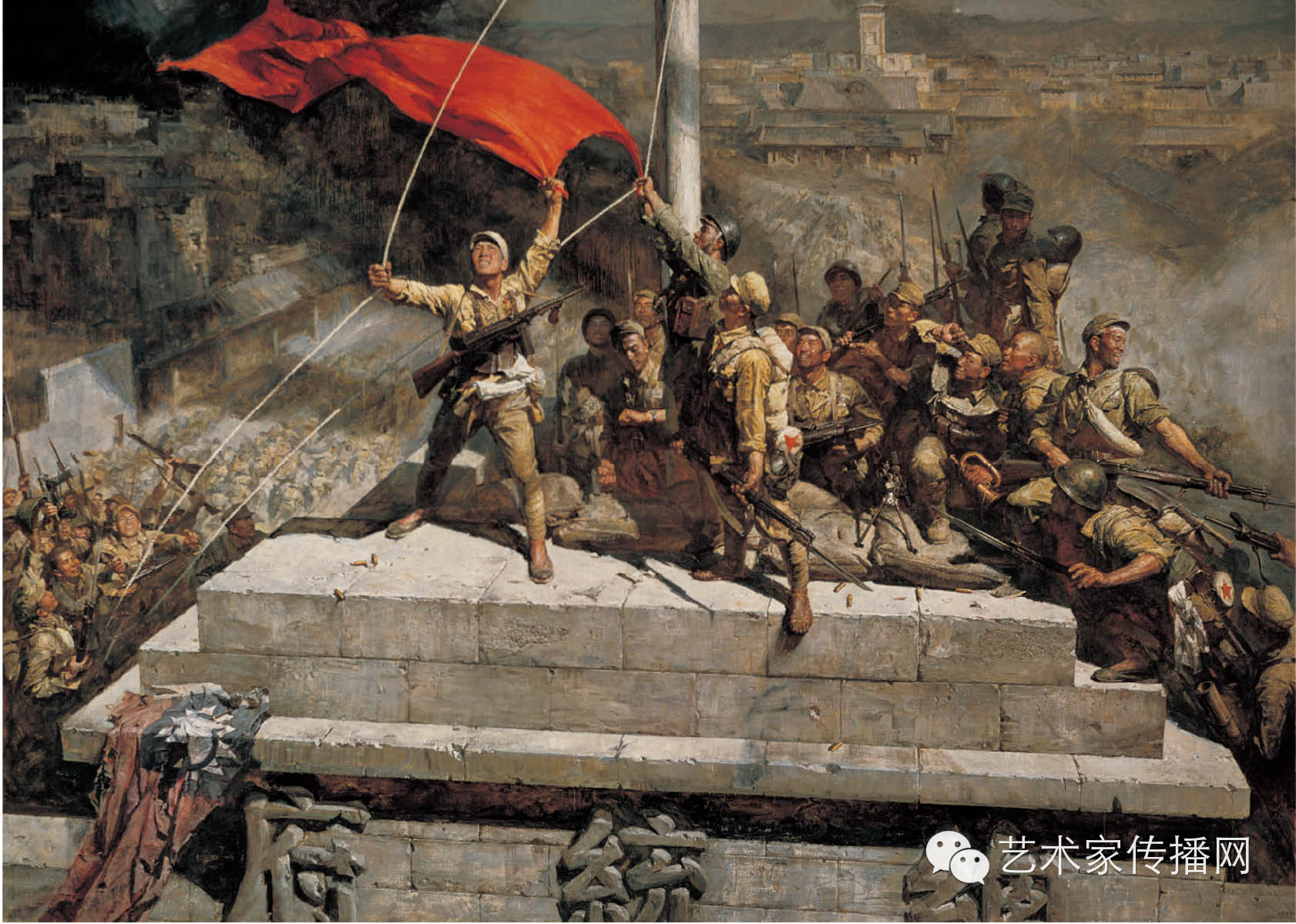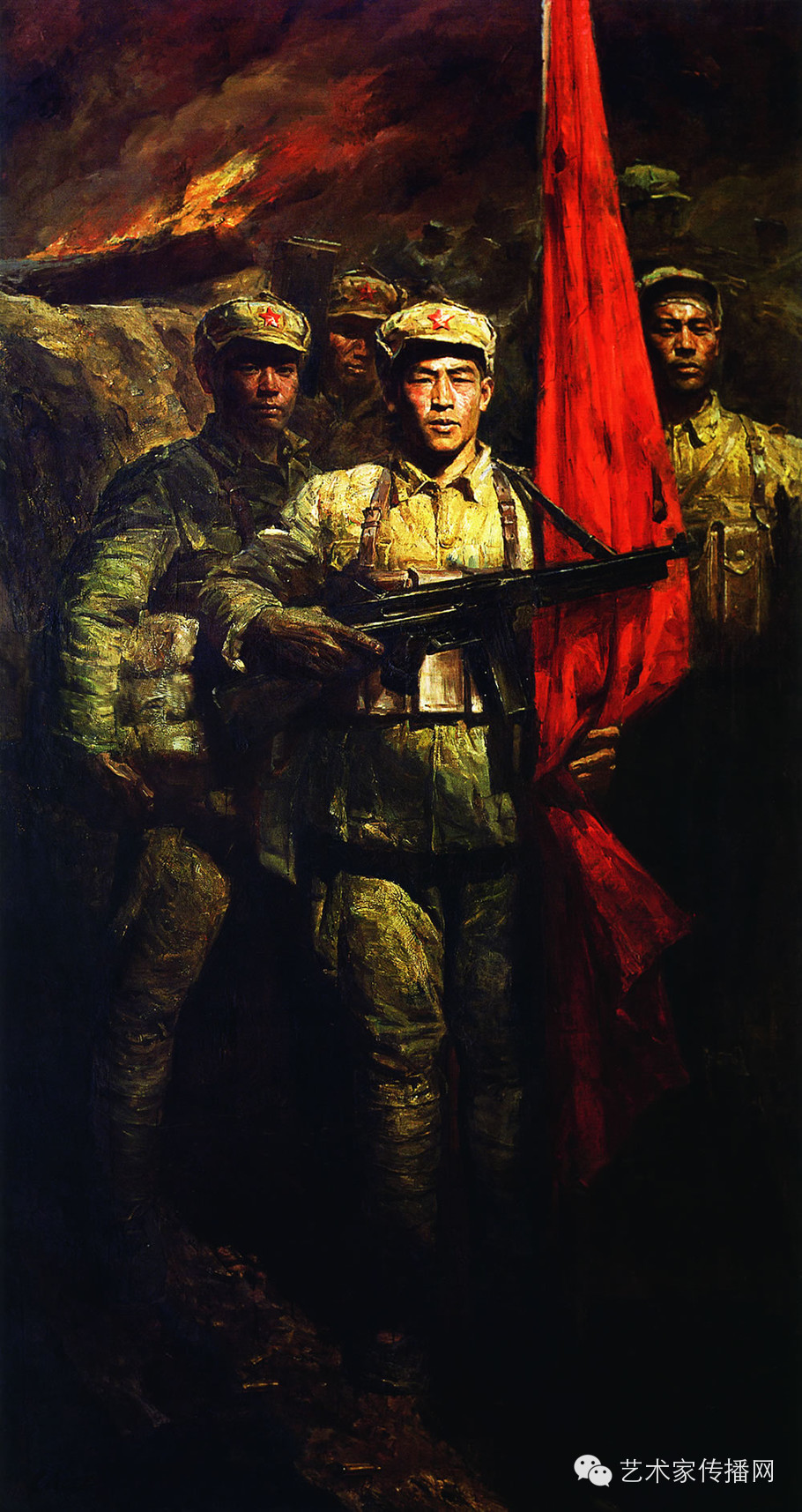 1976年,经著名油画家何孔德力荐,与魏景山合作,为中国人民革命军事博物馆创作油画《占领总统府》一举成名作、此作追求火辣辣的原生形态的真实感,把优秀习作方能达到的写实程度第一次搬上了大型历史画,整幅画将视点集中在那名胸挂冲锋枪的升旗战士和那面冉冉上升迎风飘扬的红旗上。 飘荡在半空的红旗使画面充满动感,预示着一个伟大新时代即将来临。这幅画气势磅礴,结构紧凑,富有强烈的艺术感染力。这幅作品可说是新中国油画中难得一见的大气之作。