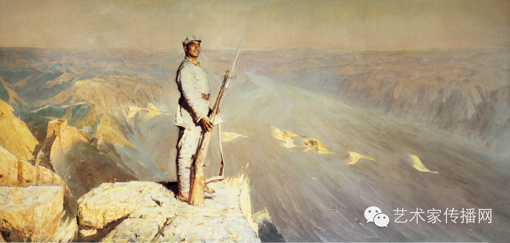 此作画面上是一位持枪挺立的威武雄壮的战士,配以苍莽的河山和低飞的群雁作背景,完满地构成了一个诗意葱茏的壮阔的艺术境界。
