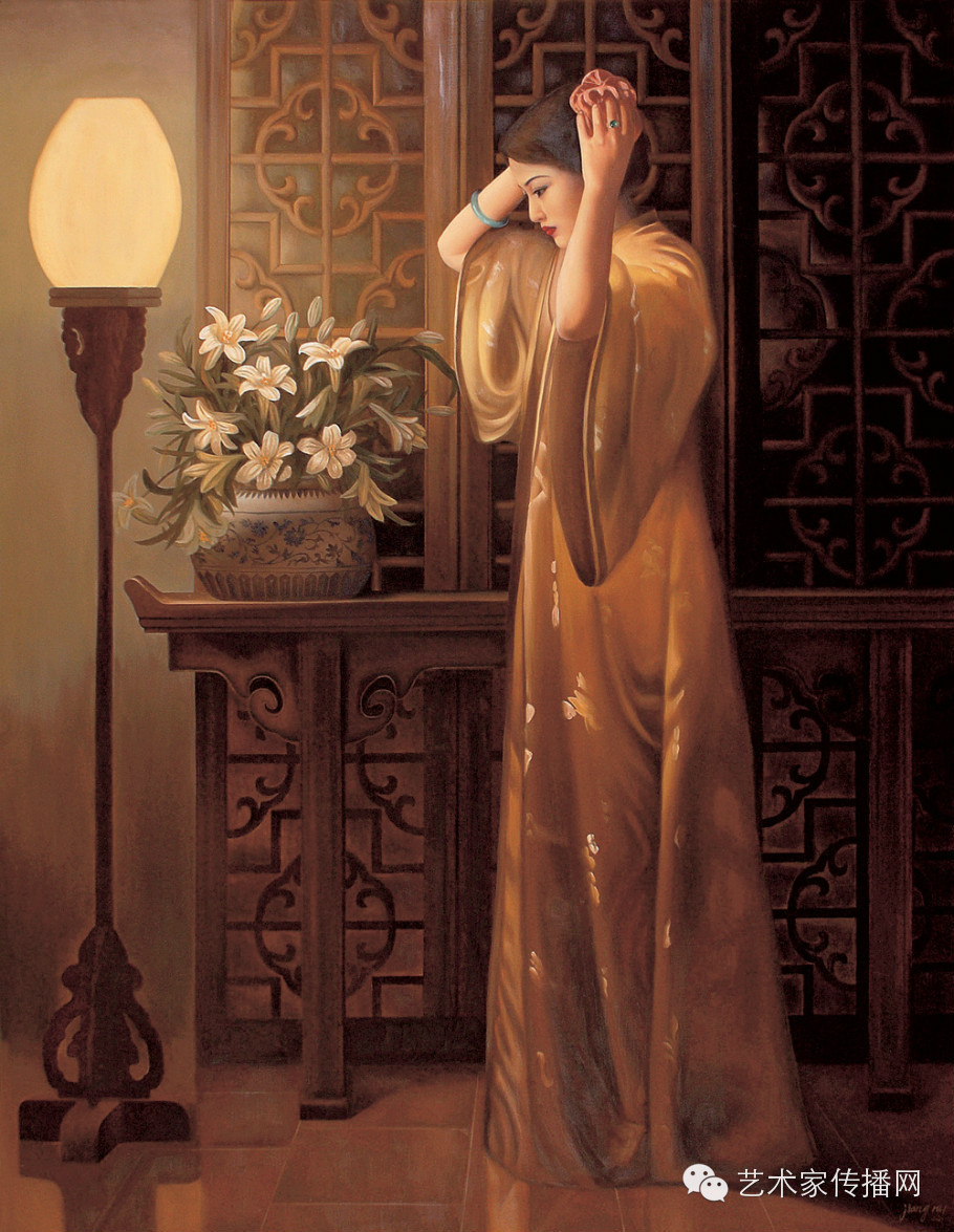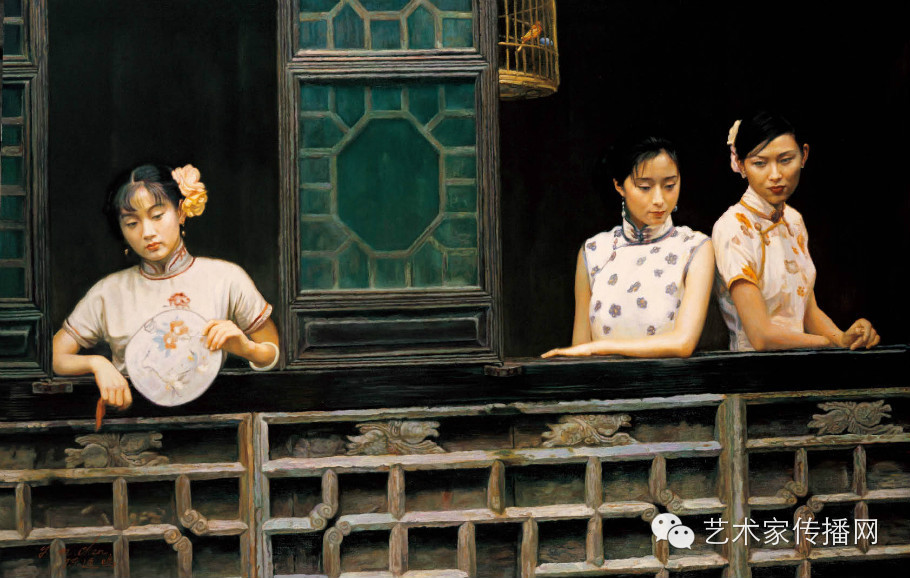 90年代初,陈逸飞将西方古典写实画风推向极致,丝丝入扣地遵循着精致、细腻的完美准则,用炉火纯青的西方技法将他的东方美人刻画得近乎“唯美”,并带有浓厚的脂粉味,而其作品命名也大多出自中国古典诗词中的典雅意象。