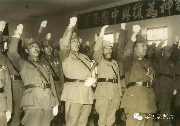 汪精卫在中央军官训练团开学典礼讲话,下面军官高呼响应,右边墙上还挂着“复兴中华”条幅。
