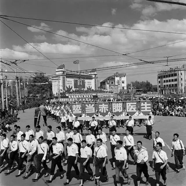 1966年10月1日,国庆节,南京市赤脚医生游行队伍。晓庄/摄。