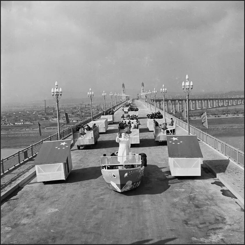 1968年,南京大桥建成举办庆祝活动,由毛主席塑像和国旗组成的庆典彩车车队浩浩荡荡地通过长江大桥。晓庄/摄。