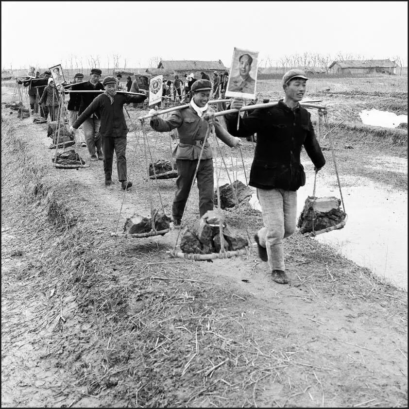 1972年,干活不忘毛主席,南通市郊农民劳动时在扁担上的挂起了毛主席像。晓庄/摄。