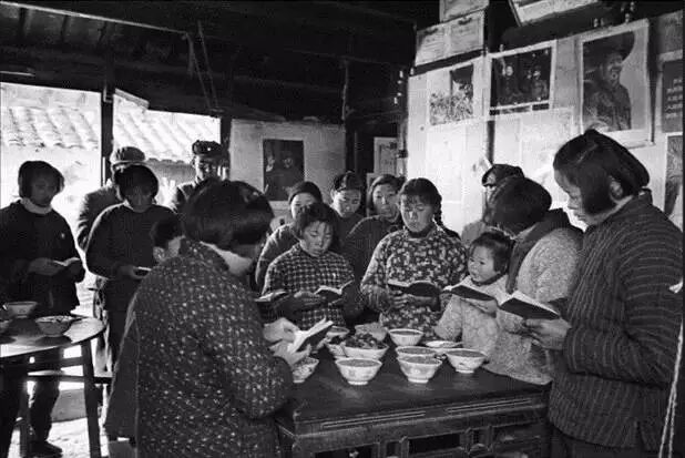 1966年,太仓县沙溪公社洪泾大队食堂里, 吃饭之前先学习毛主席语录。晓庄/摄。