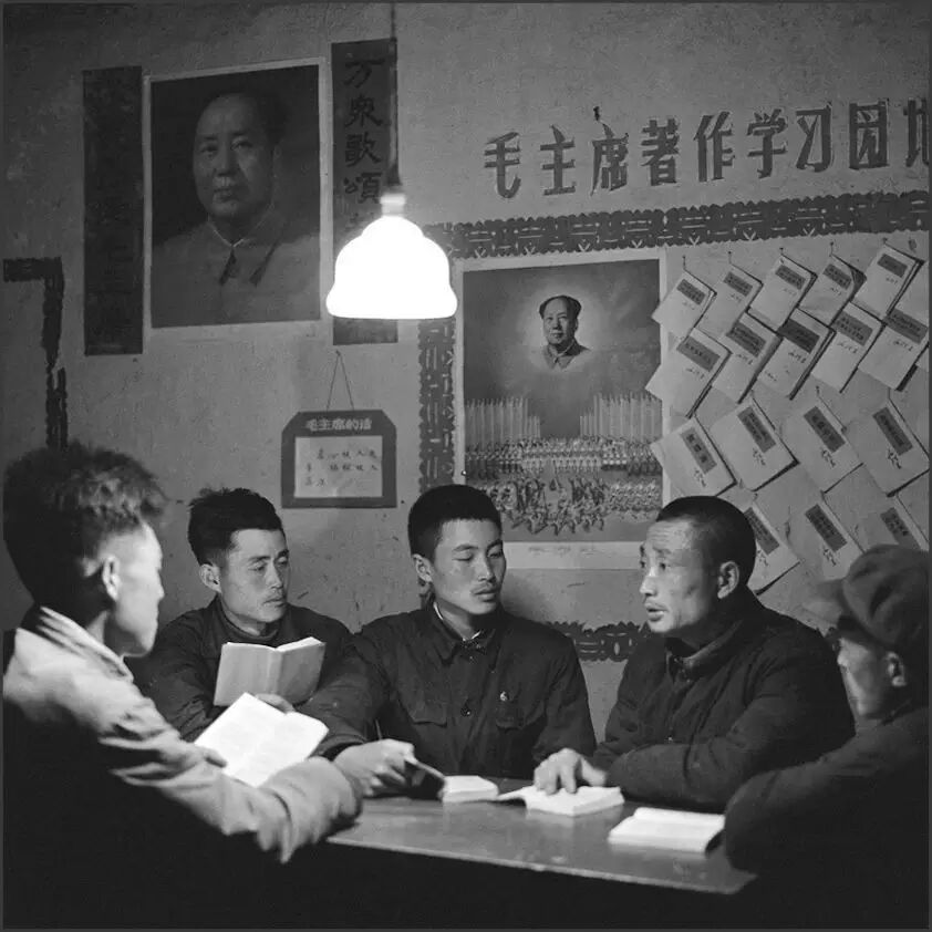 1966年,江宁县方山公社横岭大队党支部成员晚上集体学习毛主席著作。晓庄/摄。