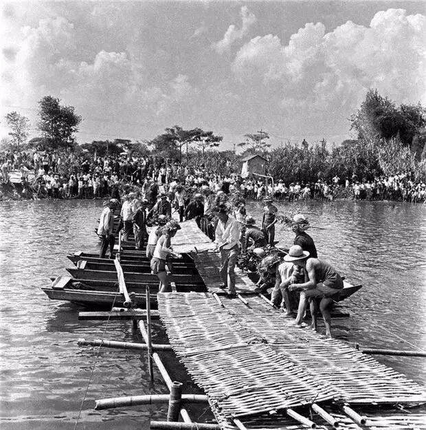 1972年,南通市人武部响应毛主席号召“备战,备荒为人民”,组织民兵架浮桥演习。晓庄/摄。