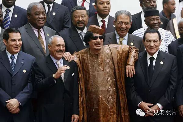 2010年,阿盟特别首脑会议在卡扎菲的故乡苏尔特开幕。卡扎菲得意地与突尼斯总统本·阿里、也门总统萨利赫、埃及总统穆巴拉克合影。