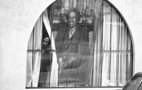 图为1980年,在美国,一名利比亚访问团成员掀起印有卡扎菲头像的窗帘向外窥探。