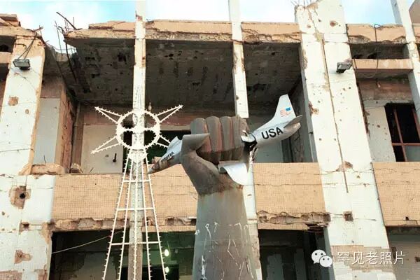 卡扎菲将炸毁的官邸保留了下来,并树立起“铁腕手抓飞机”雕塑,寓意粉碎美国霸权。