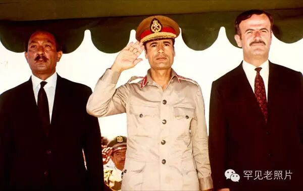 1971年8月19日,叙利亚首都大马士革,卡扎菲(中)与埃及总统萨达特(左)、叙利亚总统阿萨德就成立联盟事宜举行会晤。