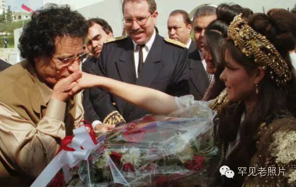 1996年10月,卡扎菲访问突尼斯,亲吻鲜花女孩的手。