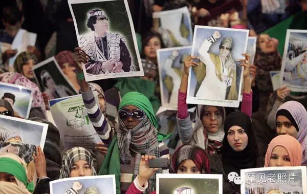图为某次学生集会上,黎波里的女大学生高举卡扎菲肖像游行,表示对他的支持。