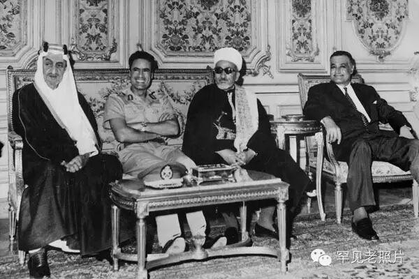 推翻伊德里斯王朝不久后,卡扎菲在摩洛哥与埃及总统纳塞尔(右二)见面。