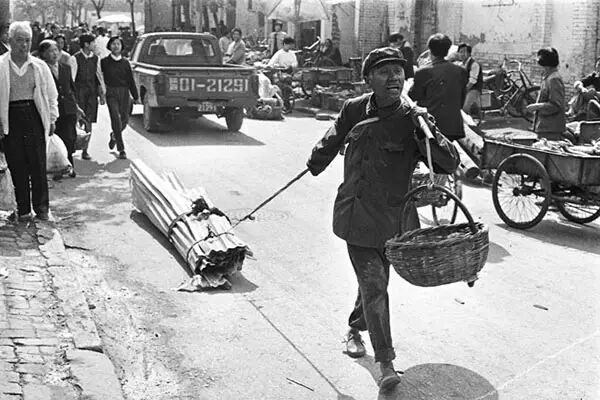 1987年,西安琉璃街,拖着东西边走边唱的老人。