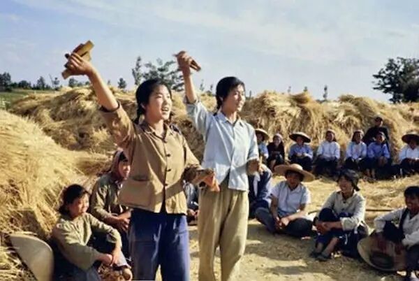 1971年,秋收时节的劳作间隙,宣传队员表演数来宝。翁乃强/摄。