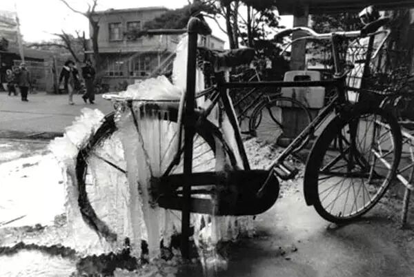 1970年代,中央美术学院院内,冬天被冻住的水管和自行车。翁乃强/摄。