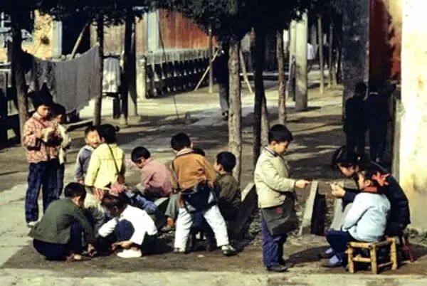 1980年代,湖南衡阳南岳镇,在街口玩耍的孩子们。翁乃强/摄。
