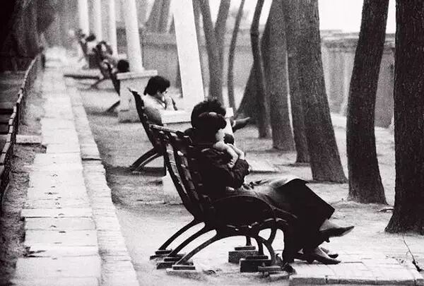 1970年代末,北京劳动人民文化宫附近,长椅上谈恋爱的年轻人。翁乃强/摄。