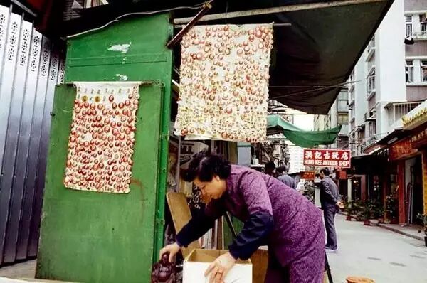 1970年代,香港摩罗街古玩市场小商店中在售卖各种毛主席像章。翁乃强/摄。