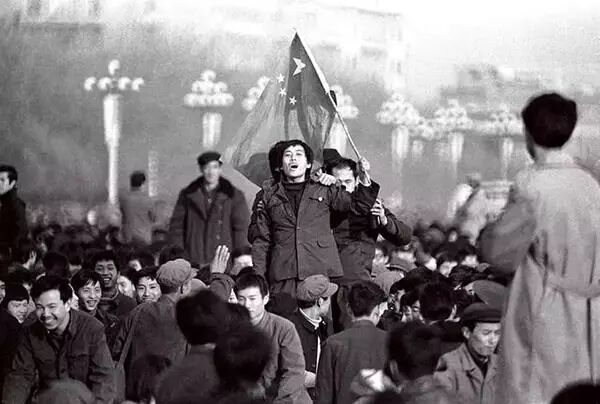 1985年,东京女排世界杯上,中国女排战胜古巴队实现“四连冠”,举国欢呼,年轻人到天安门广场高呼“振兴中华”。翁乃强/摄。