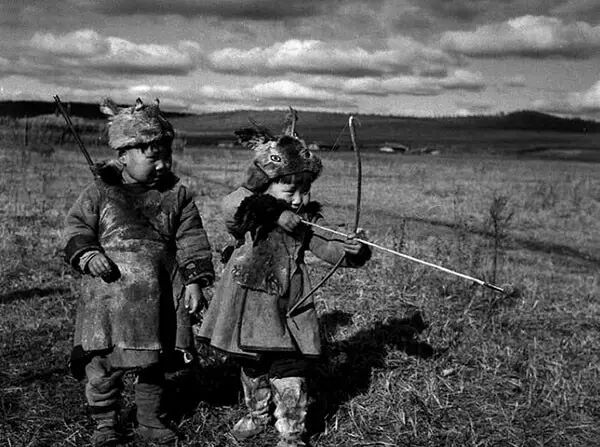 1954年,黑龙江省,两个鄂伦春族儿童学习射箭。庄学本/摄。