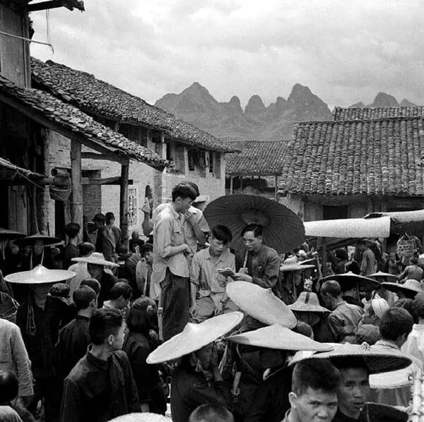 1957年,广西省,毛南族人在市场上把党的政策编成山歌唱给群众听。许信尧/摄。