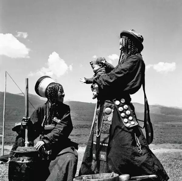 1950年,捣酥油茶与抱孩子的藏族姐妹。