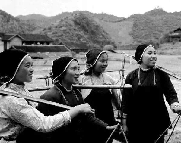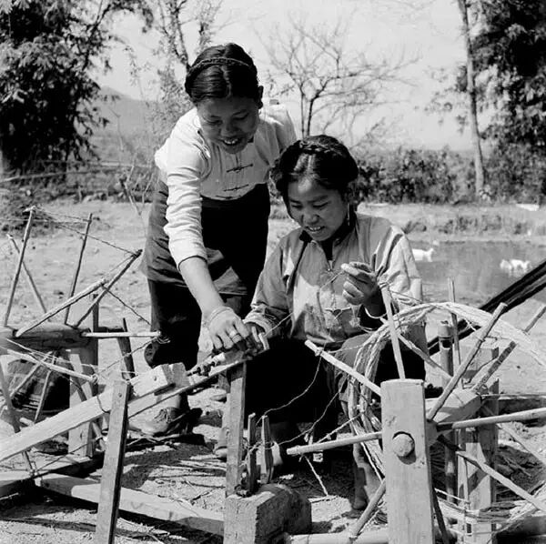 1959年,云南省,两位阿昌族姑娘正在纺线。王耀知/摄。
