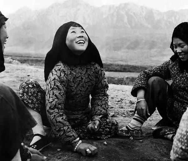 1956年,甘肃省保安族姑娘玩抓石子。马鼐辉/摄。