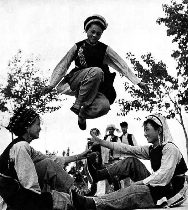 1962年,云南省大理,白族姑娘玩“看谁跳得高”游戏。朱嘉凯/摄。