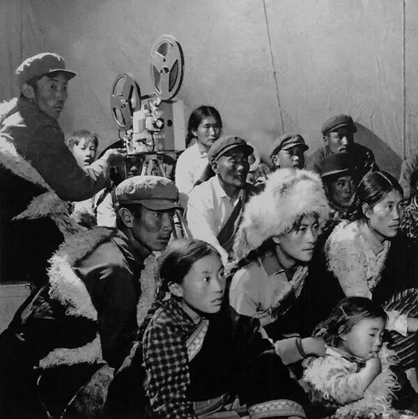 1976年,青海省,为居住分散的牧民放映的毡房电影。 茹遂初/摄。
