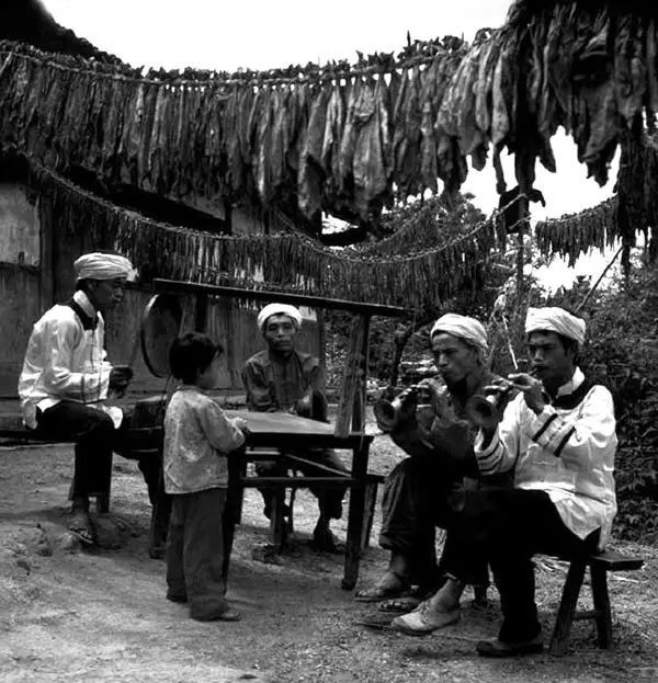 1974年,贵州省,仡佬族村民吹奏民间乐器“哨喇”。刘启俊/摄。