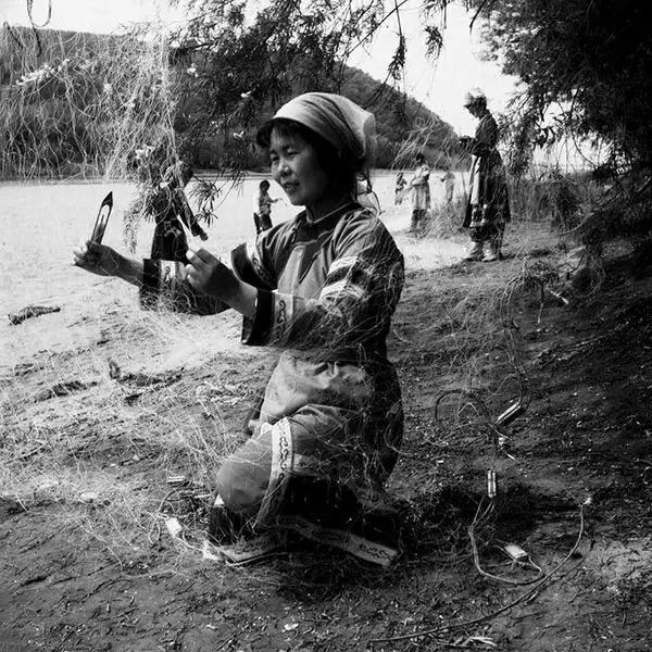 1979年,黑龙江省,河边修补渔网的赫哲族妇女。