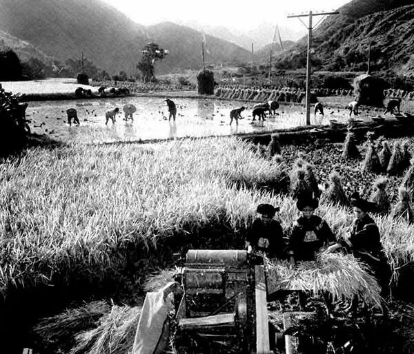 1970年代,贵州省三都县水族社员在抢收早稻,插栽晚稻。