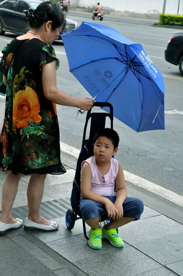 2017年,成都,家长为坐在路边的孩子撑伞。尤慕达/摄。