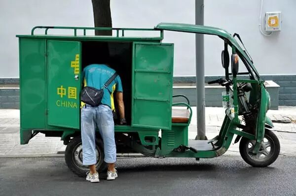 2017年,成都,邮递员的三轮电瓶车 。尤慕达/摄。