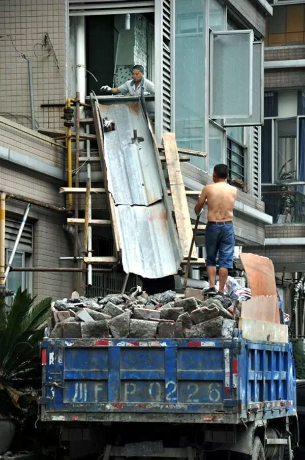 2017年,成都,一位小区居民装修时,从楼上搭一滑槽直接往车上倒建筑垃圾。尤慕达/摄。