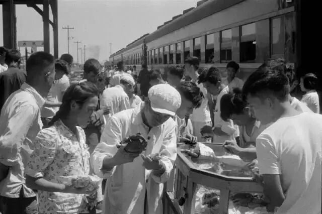 北京开往沈阳的列车,乘客在站台上购买食品。