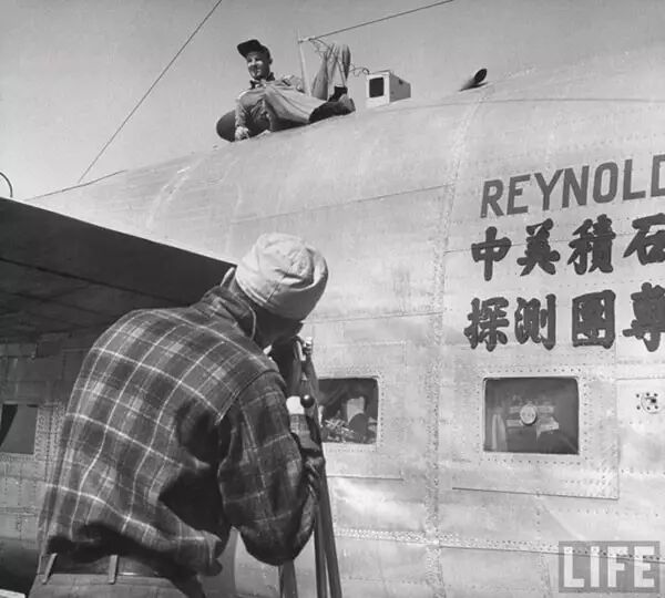 1948年4月,中国,美国大兵在飞机上拍照留影。