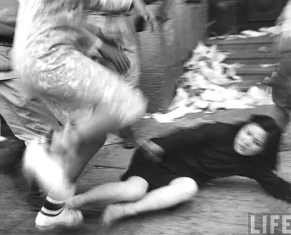 1948年6月,上海,上海交通大学的学生反美示威,被警察冲倒的学生。