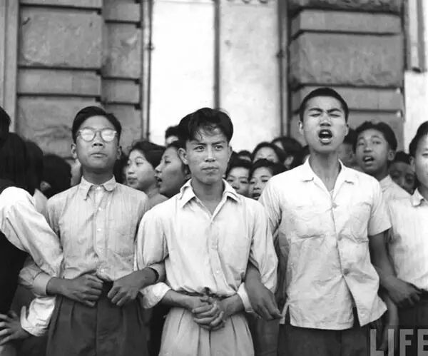 1948年6月,上海,上海交通大学的学生手挽着手组成人墙,反美示威。