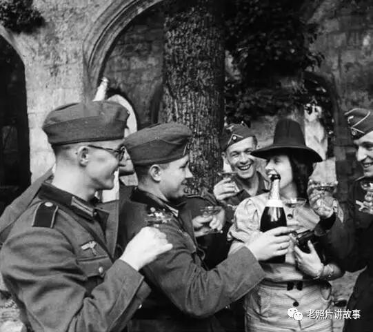一个法国女人和一群德国军人喝酒。