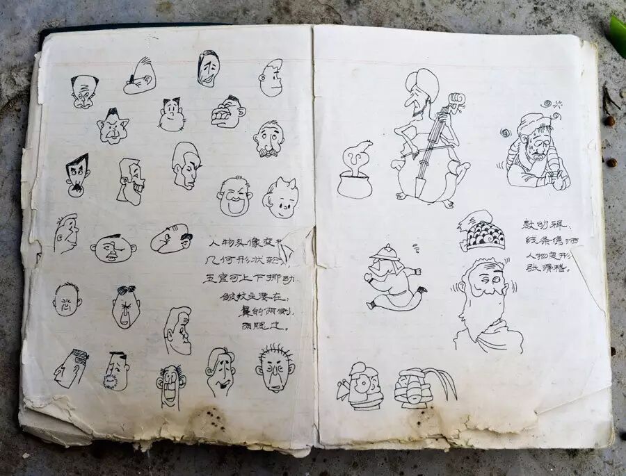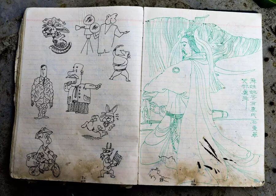就是这本,封面已经发霉起皱了,内页也是破破烂烂,感觉翻看用力一点都会破碎掉。本子里面,画满了密密麻麻的小漫画。恩,这是我读初中二年级时,初学漫画的笔记和临摹本。