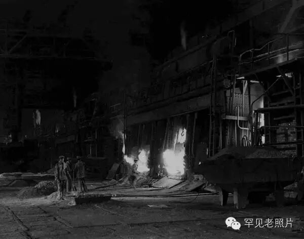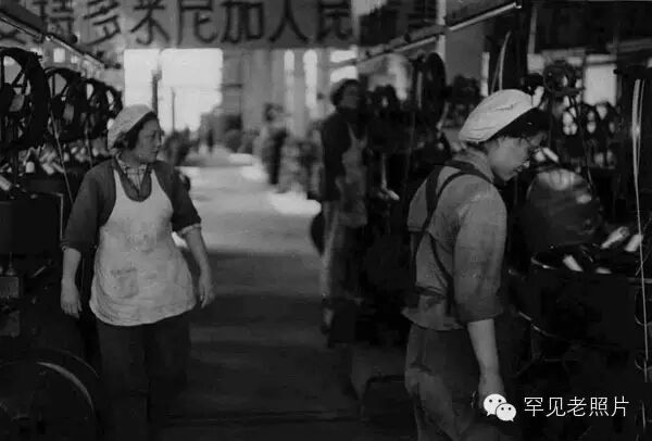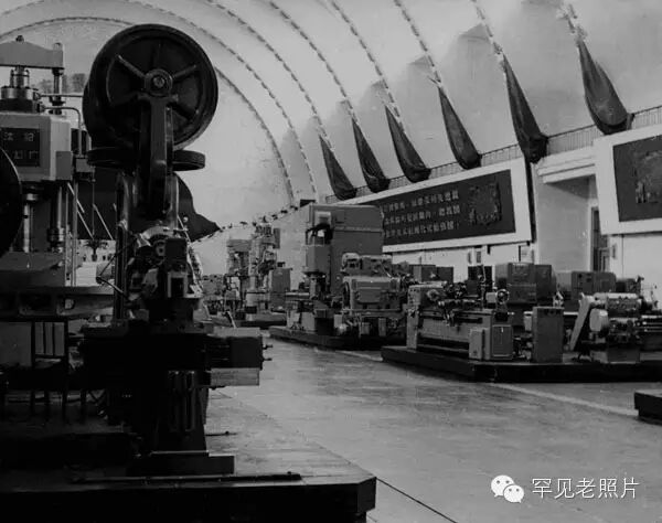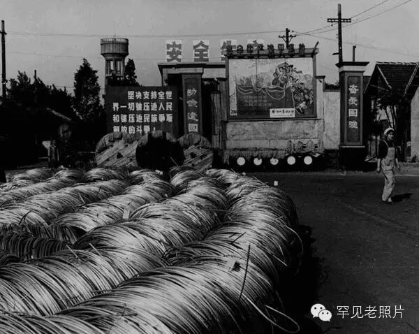 1965年,上海有线电视工厂。海报上三个红色标语“总路线万岁”,“大跃进万岁”,“人民公社万岁”。