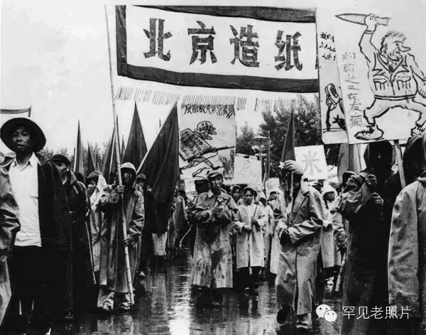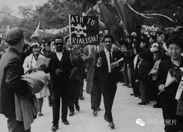 1965年,在北京工作的外国人参加集会活动。他们的横幅上写道“死神帝国主义!”。