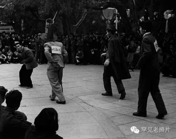 1965年,北京城市公园内街头剧,内容是讽刺美国侵略越南的罪行。戴高帽子演员扮演的是约翰逊总统。