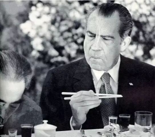 1972年,尼克松访华。尼克松看周总理如何使用筷子。